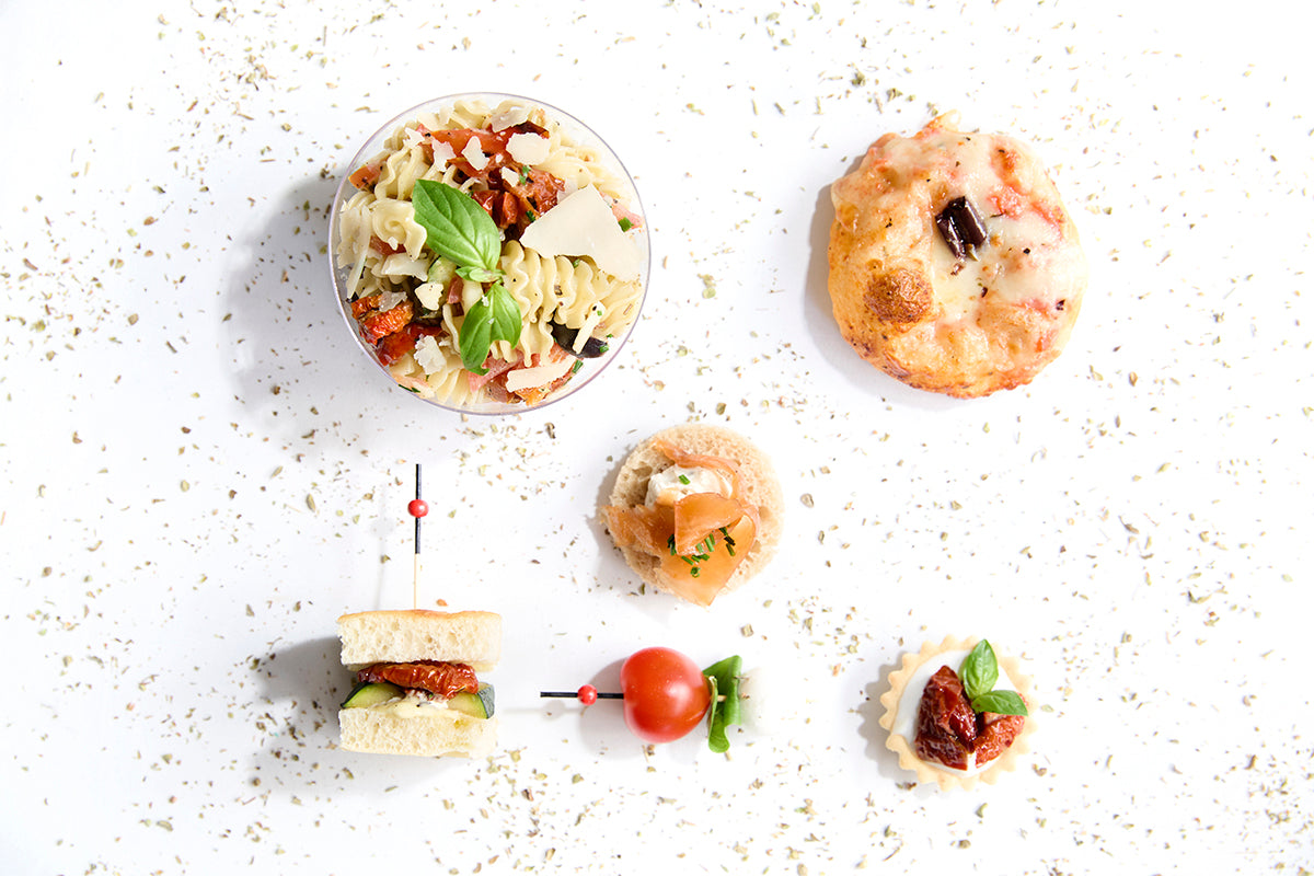 Pâtes, pesto rosso, antipasti de courgette et d’artichaut, mozzarella di Bufala, parmesan